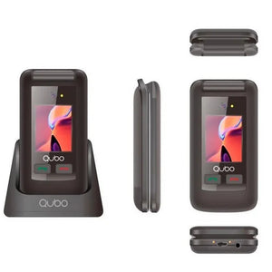 Móvil básico / senior Qubo Senior X-247 2G en color negro con pantalla de 2.4" + externa 1.77" VGA, 240 x 230 píxeles, 32MB RAM + 32MB internos, 2G, SIM + SIM, bluetooth, audio jack, radio FM y botón SOS, cámara trasera de 0.3MP, batería de 1.000mAh, conector USB-C y base de carga.