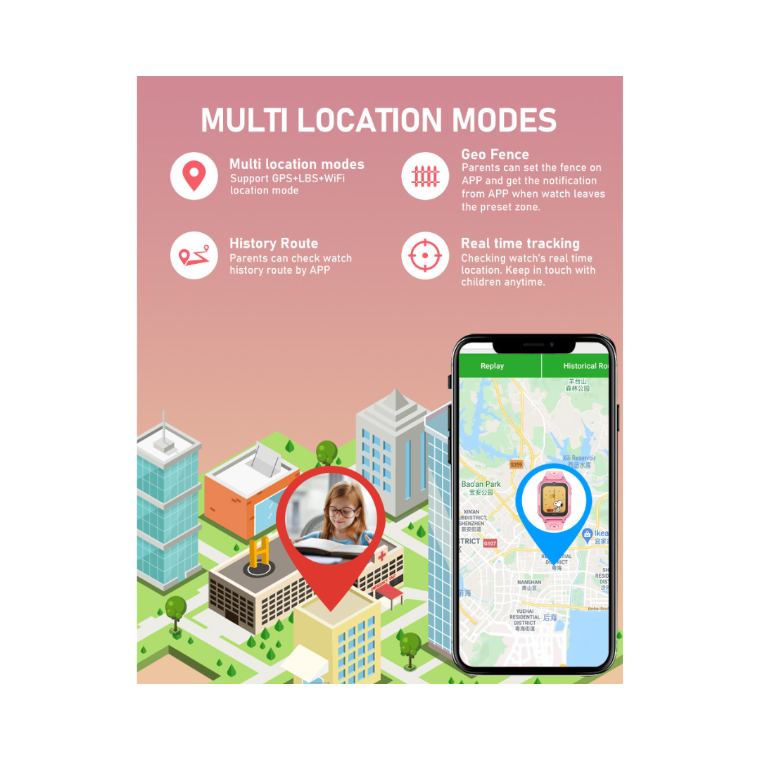📍 Localización: Posicionamiento GPS + LBS + Wi‑Fi para ver la ubicación del niño en tiempo real desde la app de los padres